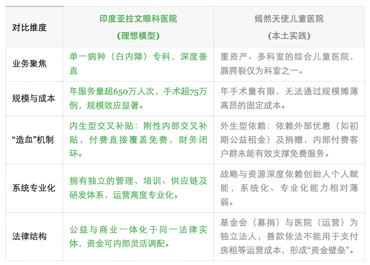 亚拉文的模式已发展为一个拥有十余家医院、上百个基层中心的网络,并输出其管理体系、培训学院和制造机构,形成了独立且完整的生态系统。嫣然医院与亚拉文在核心模式上的差异,决定了前者难以实现后者的可持续性。关键分野如下: