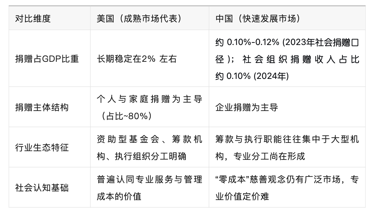 为了更清晰地展示这种结构性差异,以下是中美公益慈善市场核心特征的对比: